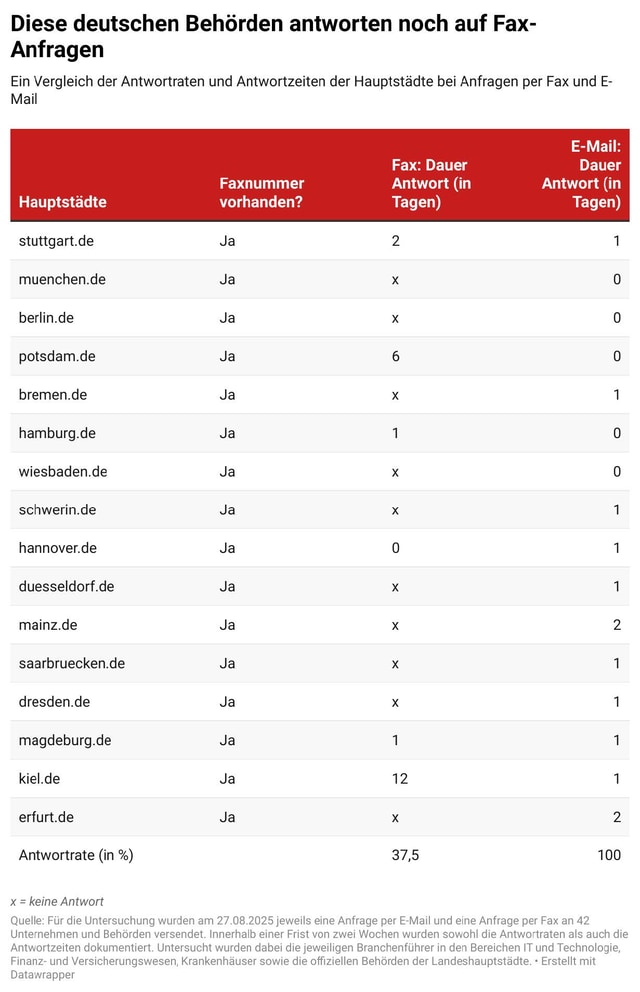 Die offiziellen Webseiten der Landeshauptstädte zeigen, dass digitale Kommunikation funktioniert. Auf E-Mails antworteten alle Städte, im Schnitt innerhalb von 0,81 Tagen. Das Fax hingegen erreichte nur 37,5 Prozent der Städte, mit einer durchschnittlichen Antwortzeit von 3,67 Tagen. Besonders schnell bei der Faxbearbeitung war Stuttgart mit zwei Tagen, während Kiel (zwölf Tage) und Potsdam (sechs Tage) deutlich länger benötigten. Berlin überzeugte durch besonders kurze E-Mail-Antwortzeiten, hatte aber beim Fax Nachholbedarf.