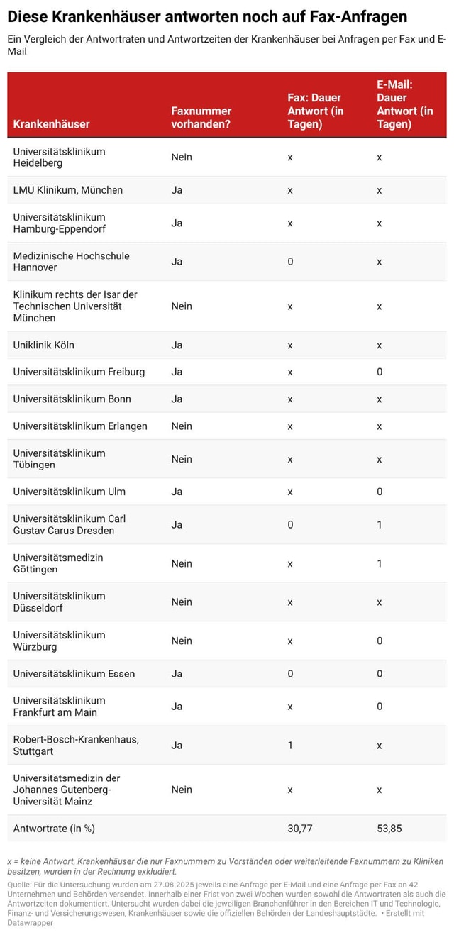 Bei den Kliniken zeigt sich ein gemischtes Bild. Die Antwortrate per E-Mail lag bei 53,9 Prozent, per Fax bei 30,8 Prozent. Wer jedoch antwortete, tat dies außerordentlich schnell: Die durchschnittliche Antwortzeit betrug 0,29 Tage per E-Mail und 0,25 Tage per Fax. Besonders reaktionsstark zeigten sich das Universitätsklinikum Essen und das Universitätsklinikum Carl Gustav Carus Dresden. Die medizinische Hochschule Hannover und auch das Robert-Bosch-Krankenhaus in Stuttgart überraschten mit einer Antwort per Fax, aber Funkstille in der E-Mail-Kommunikation.