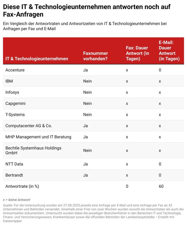Die IT- und Technologiebranche verzichtet fast vollständig auf Fax. Gleichzeitig bleibt die E-Mail-Kommunikation unzuverlässig: Nur 60 Prozent der Unternehmen antworteten auf digitale Anfragen. NTT Data, Bertrandt und Accenture antworten hier noch am selben Tag, was auf vorhandene digitale Strukturen hinweist, jedoch Lücken in der Verlässlichkeit offenbart.